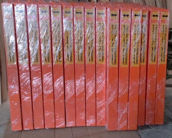 FIBER GLASS MARKER POST SIZE 120 × 120 × 1400MM THICKNESS 6MM COLOR ORANGE WITH GI SHEET WARNING SIGN PLATE SIZE 480 × 90MM & ARROW 90 × 90MM THICKNESS 1.5MM HOLE 8MM (UNDERGROUND TELEPHONE CABLE COLOR YELLOW & BLACK – WRITE ENGLISH & ARABIC SCREEN PRINT) (1 PCS 5.5 KG ARAMCO STANDARD)